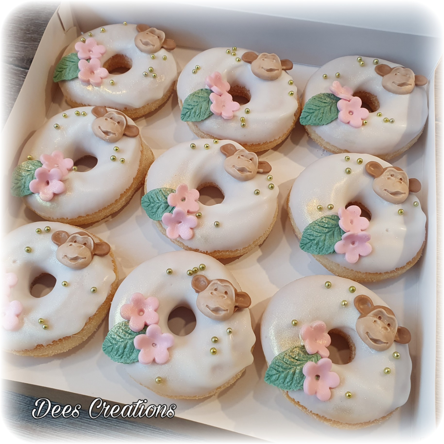 Donuts op de taart kan ook. Versieringen bijpassend bij de stijl van de taart.